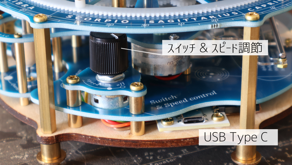 惑星の公転スピードはつまみを回して無段階調節可能で電源のon/offを切り替えることもできます