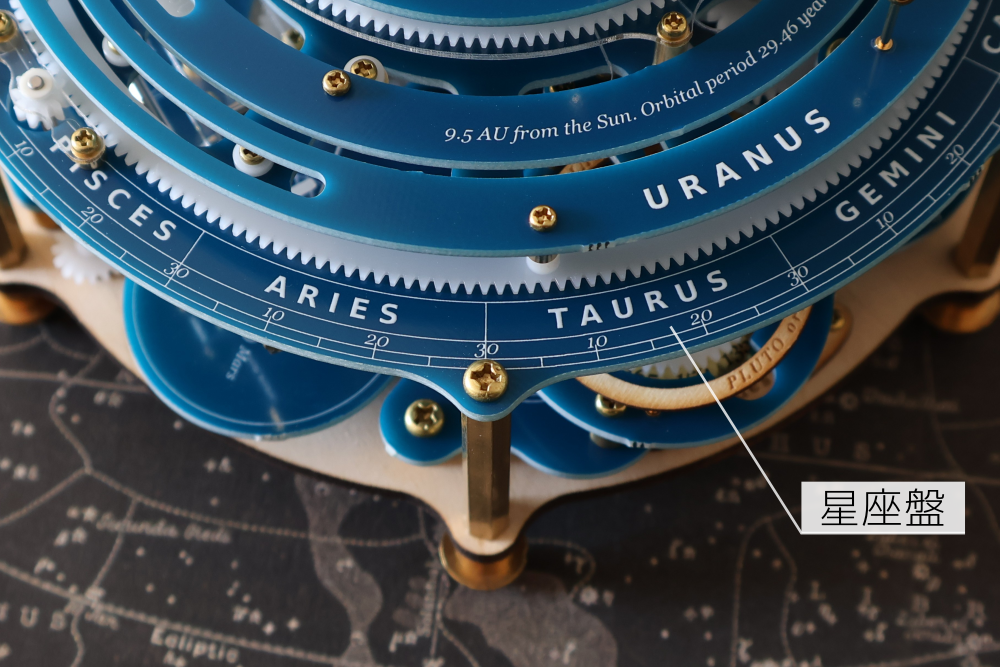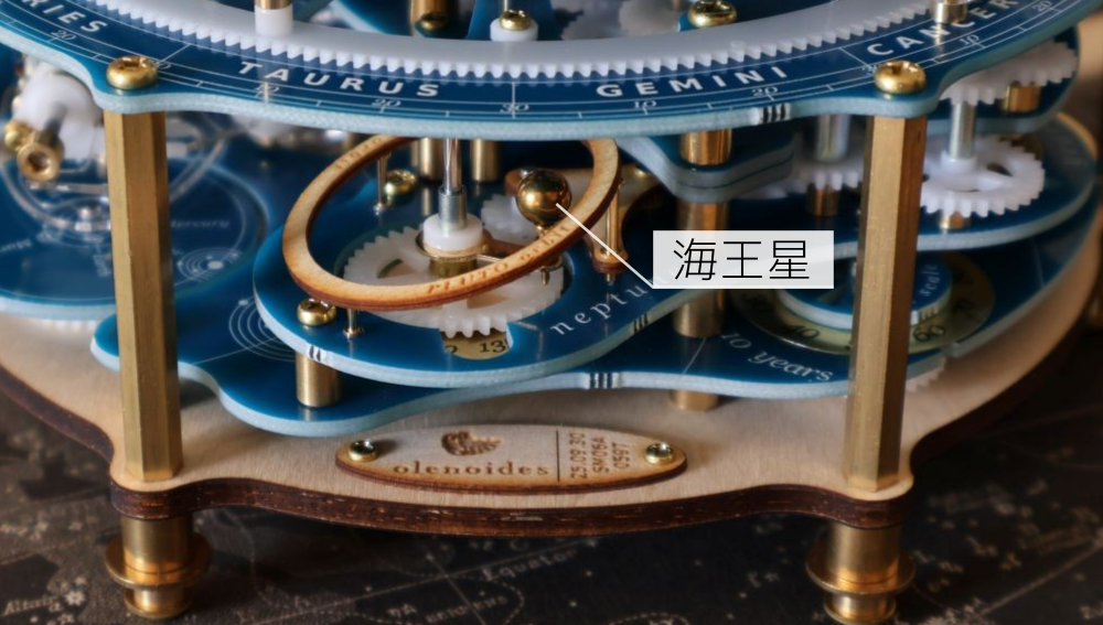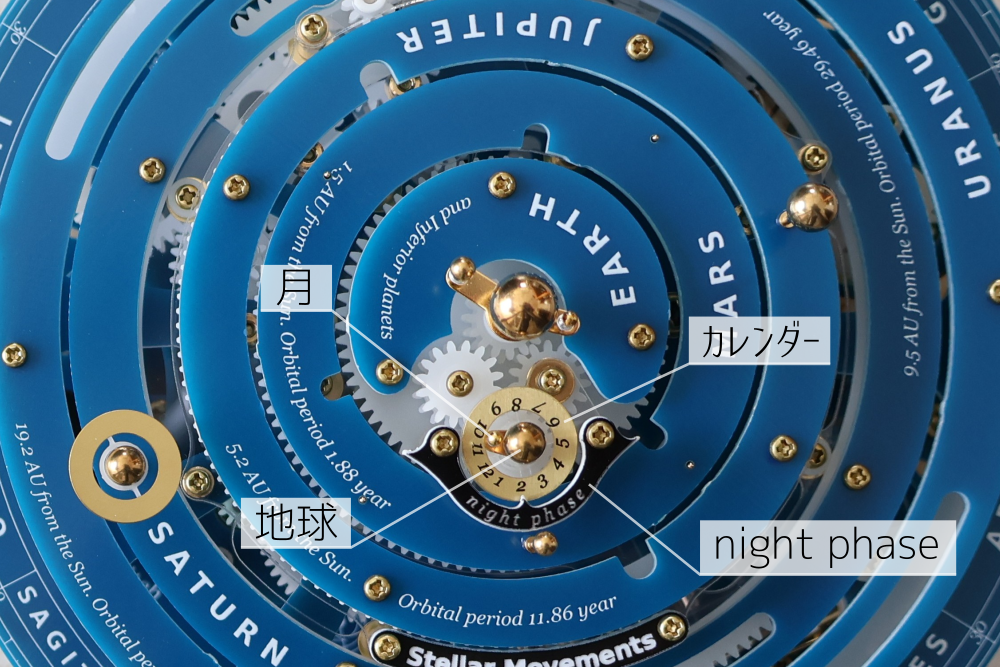 天板下には独自の機能として海王星、テンペル・タットル彗星、月相、タイムスケールを配置し、天板上の惑星と同期して運動します。