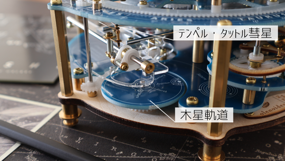 特に楕円軌道を描くテンペル・タットル彗星はこれまでどの太陽系儀にもなかった新しい機能で、惑星軌道とは一味違った動きを見ることができます。